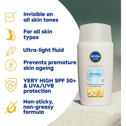 NiveaCremă solară Nivea SUN UV Face Invisible Daily Fluid cu un SPF50+ oferă protecție eficientă împotriva razelor UV, fiind ideală pentru utilizarea zi...