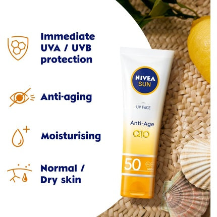 NiveaCremă solară pentru față Nivea cu coenzima Q10 și protecție solară SPF50, aceasta este ideală pentru protejarea zilnică a pielii împotriva razelor ...